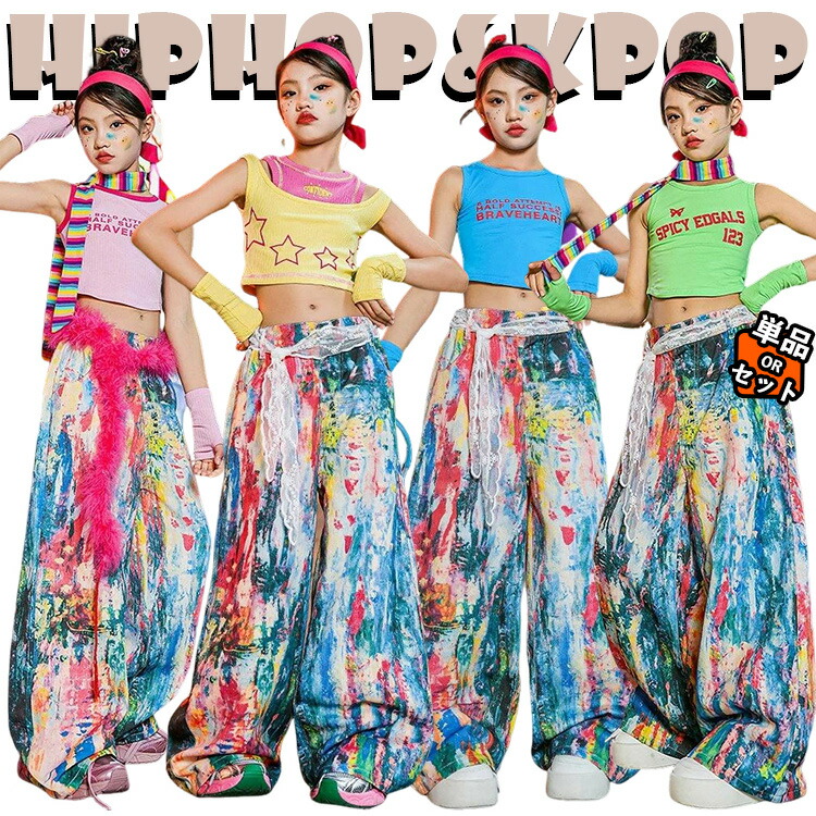女の子 JAZZ 韓国 k-pop キッズ ダンス衣装 セットアップ 柄パンツ チア チアガール ダンスパンツ へそ出し 肩だし トップス カラフル