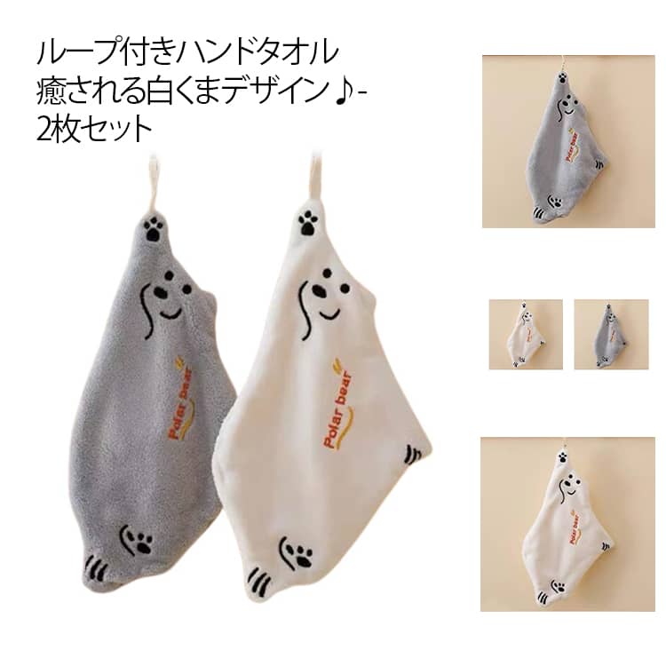 ふわふわ 子供 ループタオル 2枚セット ハンドタオル シロクマ 手洗い かわいい 保育園 幼稚園 フリース 学校 速乾 吸水 手拭きタオル ひも付き 食器拭き 洗面所 グレー キッチンタオル