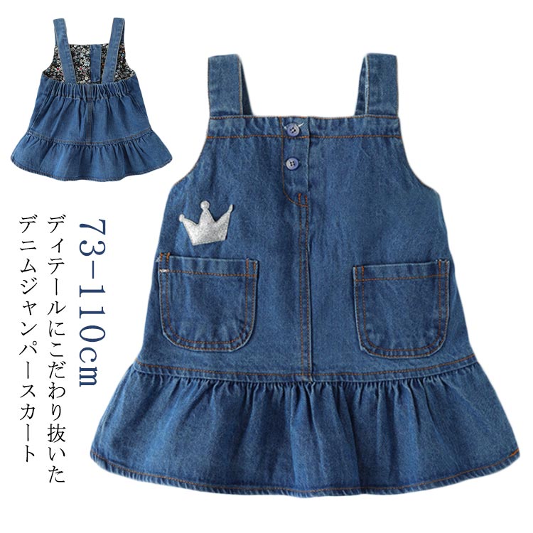 王冠 デニム ジャンパースカート キッズ 子供服 デニムワンピース ワンピース 73 デニムスカート 女の子 フリル スカート 可愛い サロペット 90 110 ポケット付き ガールズ 100
