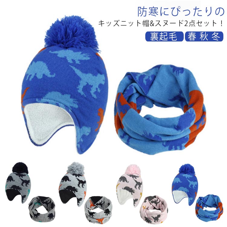ニット帽 キッズ ネックウォーマー ベビー 耳当て 帽子 秋冬 ニットキャップ マフラー 2点セット 恐竜 耳あて 裏起毛 ポンポン付き 暖か 裏ボア