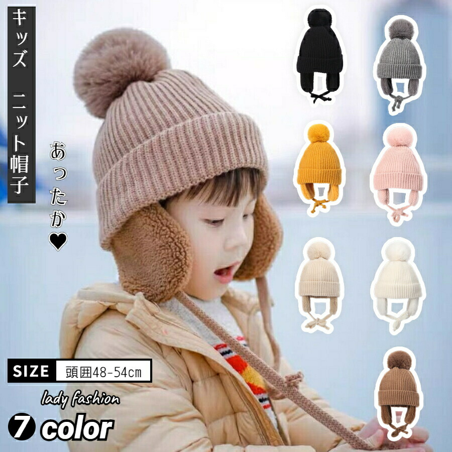 耳あて付き ベビー キッズ ニット帽 ボア 防寒 ポンポン付き 秋冬用 無地 かわいい 7色 男女兼用
