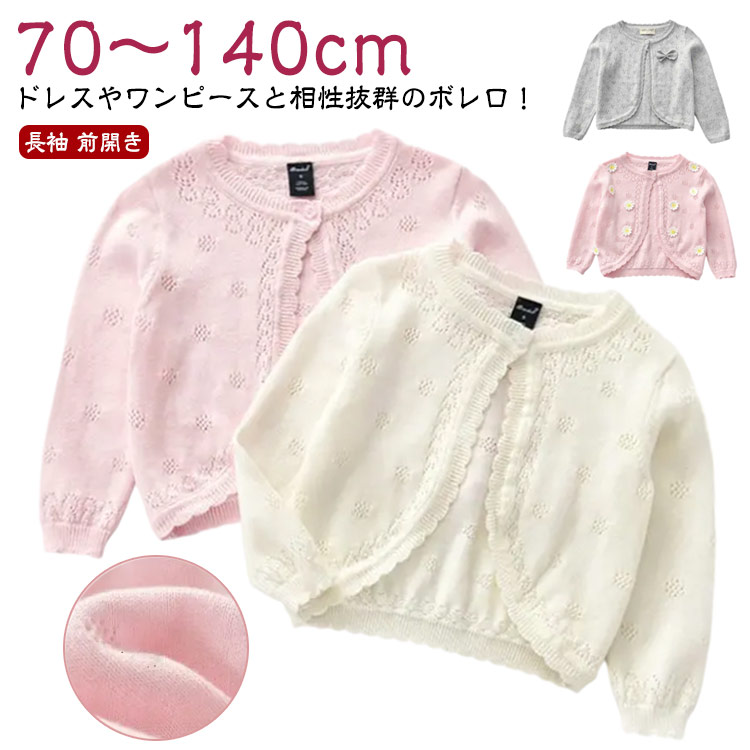 女の子 カーディガン キッズ フォーマル ボレロ ベビー 子供 入園 入学 バレエ 結婚式 こども用 白 紫 ピンク 綿 長袖 前開き ドレス ショット丈 コットン 冷房対策 お出かけ ニット