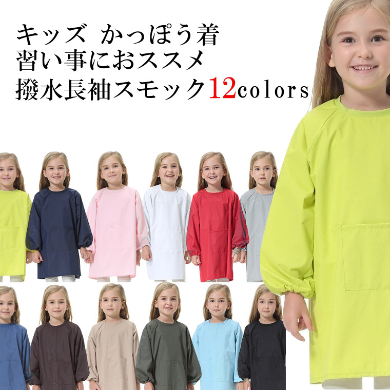 キッズ かっぽう着 撥水 料理 習字 絵画 習い事 エプロン お洋服を汚さない スモック カラフル 全12色 長袖