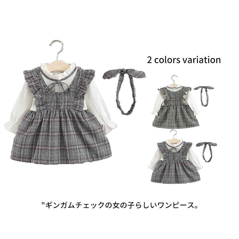ベビー 女の子 ワンピース 長袖 チェック ワンピ 2点セット 子供服 子 赤ちゃん ベビー服 ヘアバンド グレー リボン フレア シンプル カジュアル 秋 フォーマル 七五三 卒園式 冬