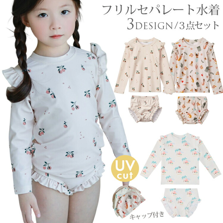 水着 ベビー キッズ 女の子 水着 長袖ラッシュガード スイムウェア 上下セット 帽子付き 3点セット 長袖 ラッシュガード カット 50+