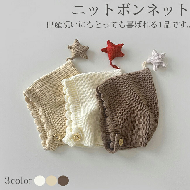 ベビー ニットボンネット 新生児 退院着 韓国子供服 ボンネット 帽子 セレモニードレスに 韓国ベビー服 出産祝い ナチュラル シンプル おしゃれ かわいい スカラップ ニット ベ 星モチーフ