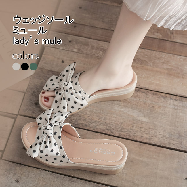 厚底 ミュール レディース ウェッジソール サンダル スリッパサンダル 蝶結び 水玉柄 レトロ 美足 スリッパ 厚底サンダル ウェッジソールサンダル ドット柄 シューズ 靴 安定感 ベ サマーサンダル