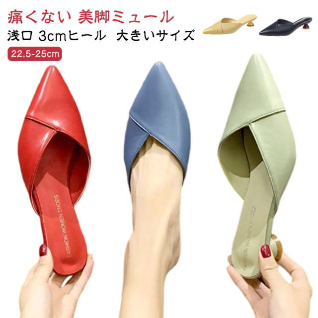 レディース ミュール 浅口 レザーサンダル オフィス サンダル 通勤 靴 美脚 ハイヒール ポイントトゥ 3cmヒール 脱げない 大きいサイズ チャンキーヒール レディースサン 美脚サンダル