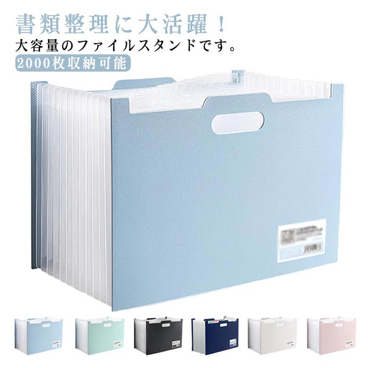4サイズ対応の伸縮式大容量ファイルスタンド。13ポケットで書類を分類整理し、持ち運びに便利な手提げ付き。