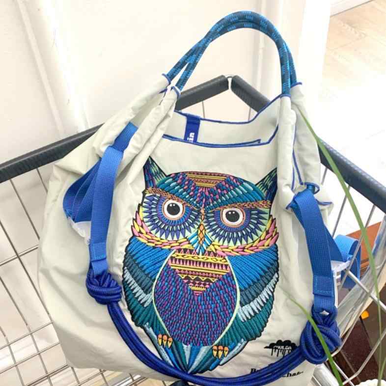 エコバッグ フクロウ 刺繡 ナイロン 撥水加工 トートバッグ ショルダーバッグ ハンドバッグ 斜め掛け 肩掛け 横型 スクエア 巾着型 軽量 デイリーユース 通勤通学 内ポケット付き 普段使い