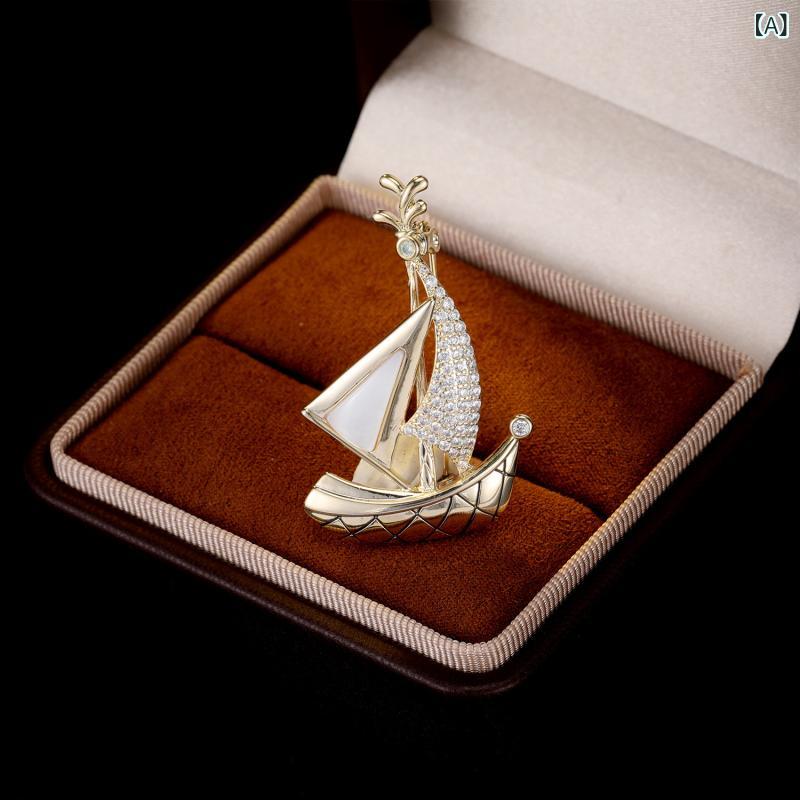 ブローチ メンズ 男性用 高級感 ゴールド レトロ ヴィンテージ 天然貝殻 帆船モチーフ 幸運のモチーフ スーツ ジャケット コート ビジネス フォーマル 電気メッキ加工 上品 胸飾り ピンバッ 銅製