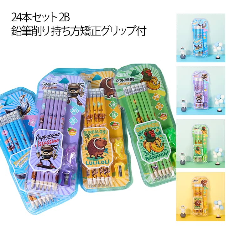 鉛筆 2B 24本セット イタリアンブレイン ロット キャラクター えんぴつ 脳腐キャラ 持ち方矯正グリップ付き 鉛筆削り 消しゴム付きえんぴつ イラスト アート 絵書き キッズ 男の子 女の子 子供