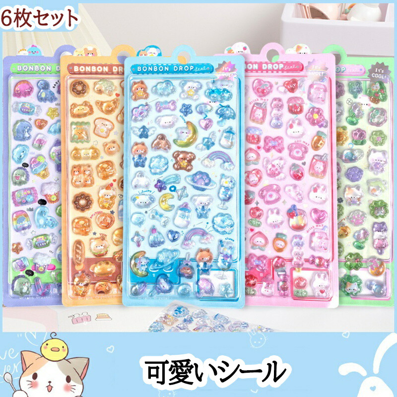 6枚セット 送料無料 水シール 可愛い 3 立体 シール キャラクター 3 立体シール ぷっくり つやつや キラキラ かわいい 動物 女の子 平成女子 シール帳