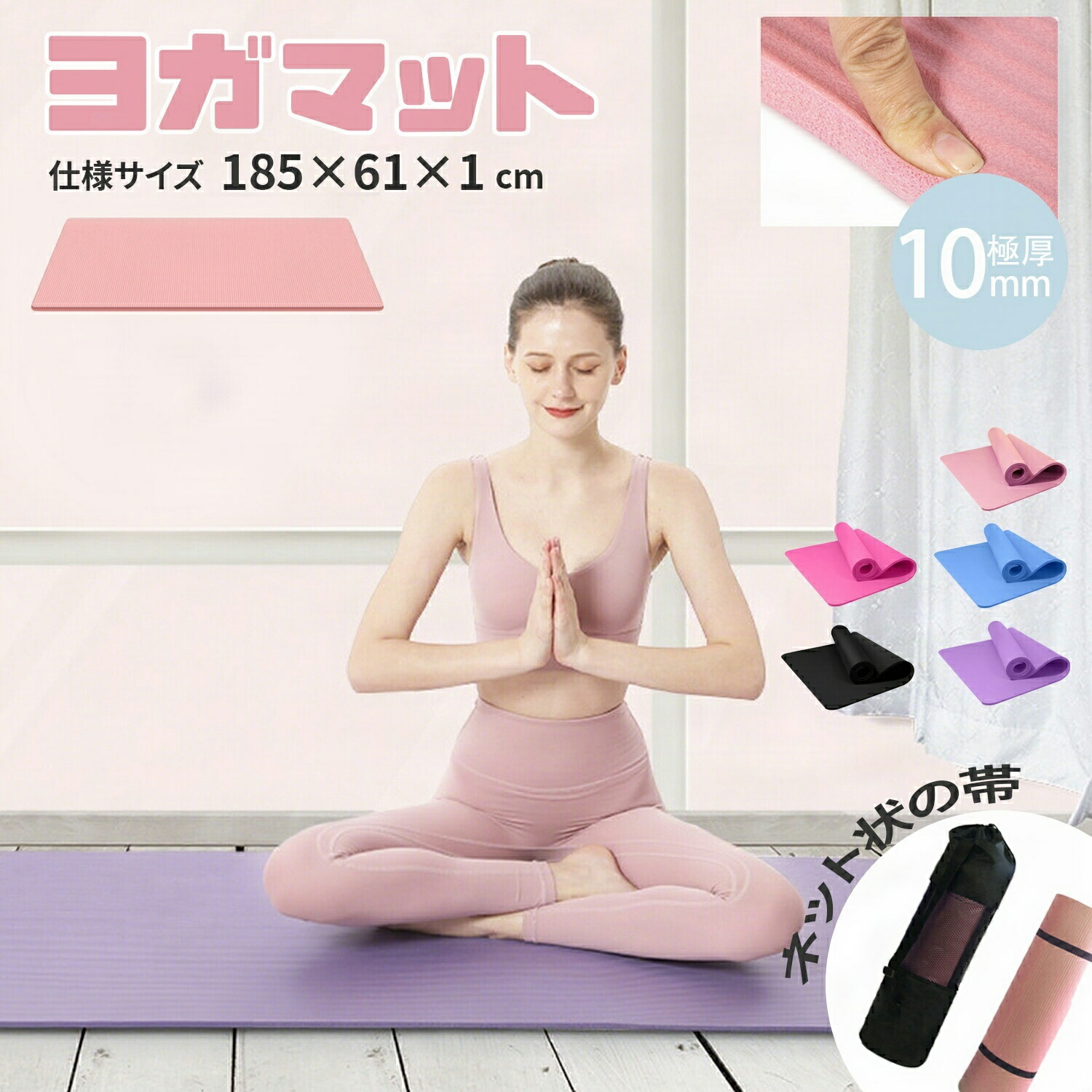 運動 マット 6サイズ ヨガマット トレーニングマット 15mm 20mm ピラティス 室内運動 収納バンド パープル フィットネスマット ブラック ピンク エクササイズ yoga 腹筋 脚痩せ 器具