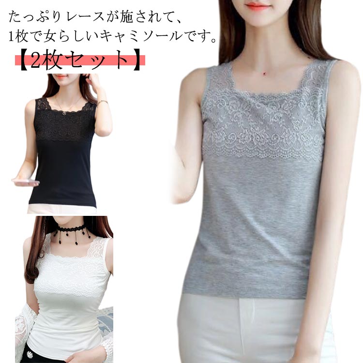 レースキャミ 2枚セット カップなし かわいい タンクトップ 胸元レース レースキャミソール ショルダーレース キャミソール ストレッチ 伸縮性 インナー レディース トップス フィット