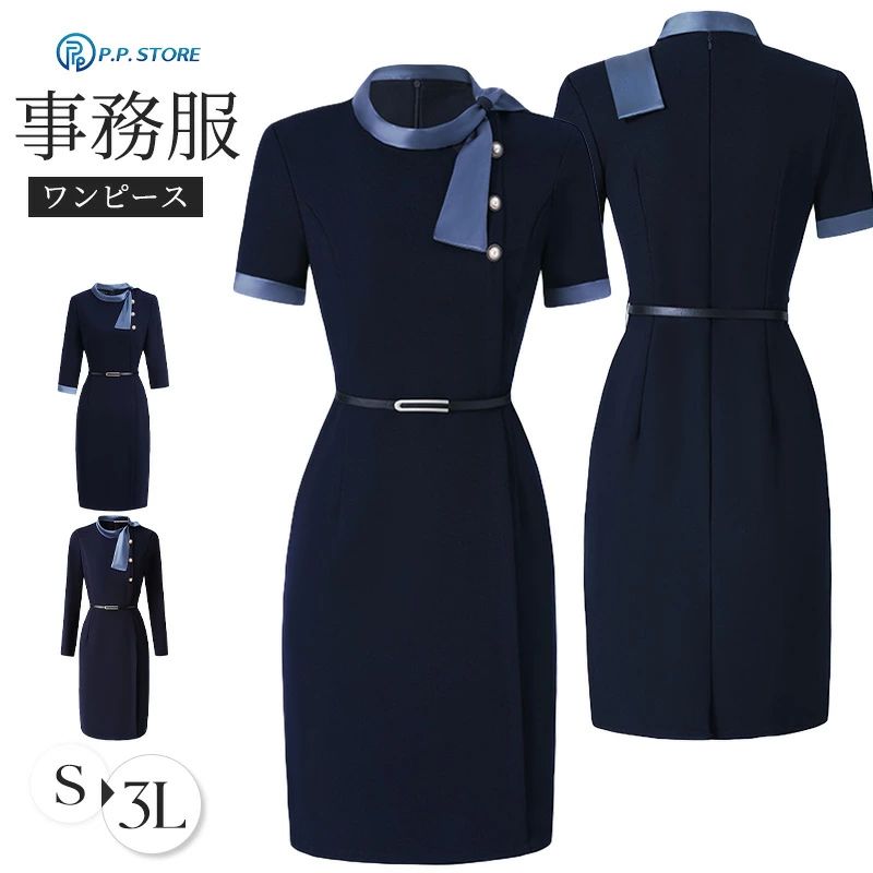 事務服 ワンピース レディース 制服 仕事服 大きいサイズ 通勤 オフィス 企業 きれいめ ネイビー 洗える