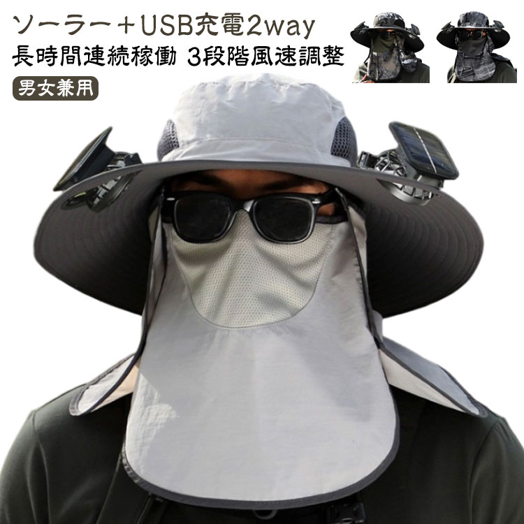ソーラー+usb充電2way 速乾 フェイスカバー付き 軽量 upf50+ 撥水 uvカット 首ガード ファン付き 扇風機付き帽子 ハット 日焼け防止 つば広帽子 アウトドア サンバイ 日除け帽子