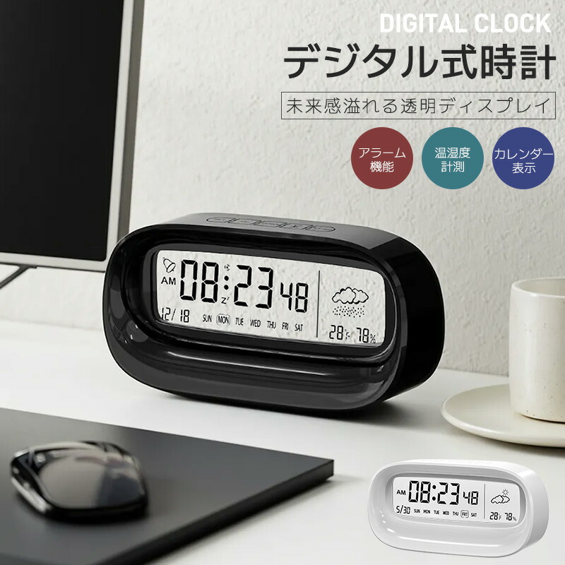 デジタル時計 デジタルカレンダー 時計 置き時計 アラーム 目覚まし時計 温湿度計測 シンプル 透明ディスプレイ 小型 スヌーズ機能 大画面 寝室 リビング インテリア 年月日 常時日付 北 曜日表示