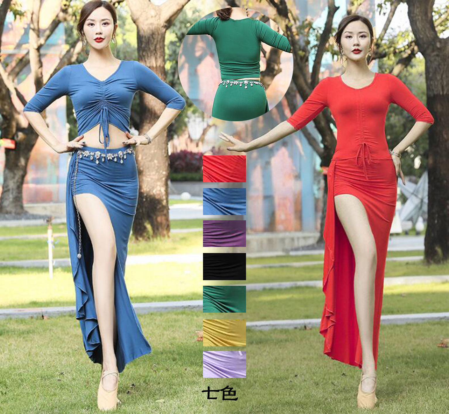 ベリーダンス衣装 レディース ベリーダンスウェア レッスン着 モダール生地 上下セット ステージ衣装 練習着 舞台衣装 ダンス教室 ダンス授業 五分袖ダンストップス ダンススカート 弾力性 7色