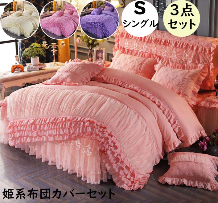 布団カバーセット シングル 姫系 レース フリル 高級感 3点セット 中綿ベッドスカート ピーチスキン加工 柔らかい お誕生日プレゼント 通気性 抗菌 布団カバー 枕カバー 寝具カバーセッ 掛けカバー