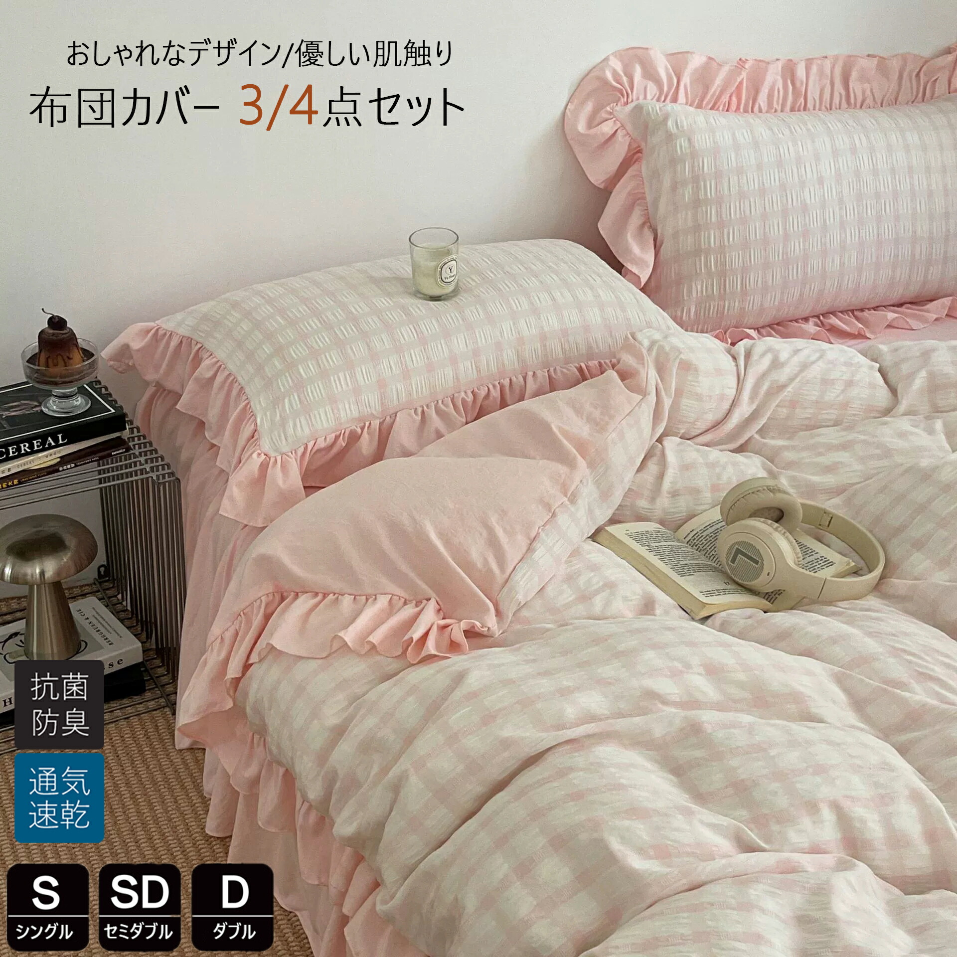 布団カバー シングル 3点セット シアサッカー生地 チェック柄 掛け布団カバーフリル付き 掛けカバー 掛けふとんカバー 布団セット かわいい セミダブル ベッドカバー 敷布団カバー 寝具カバーセット