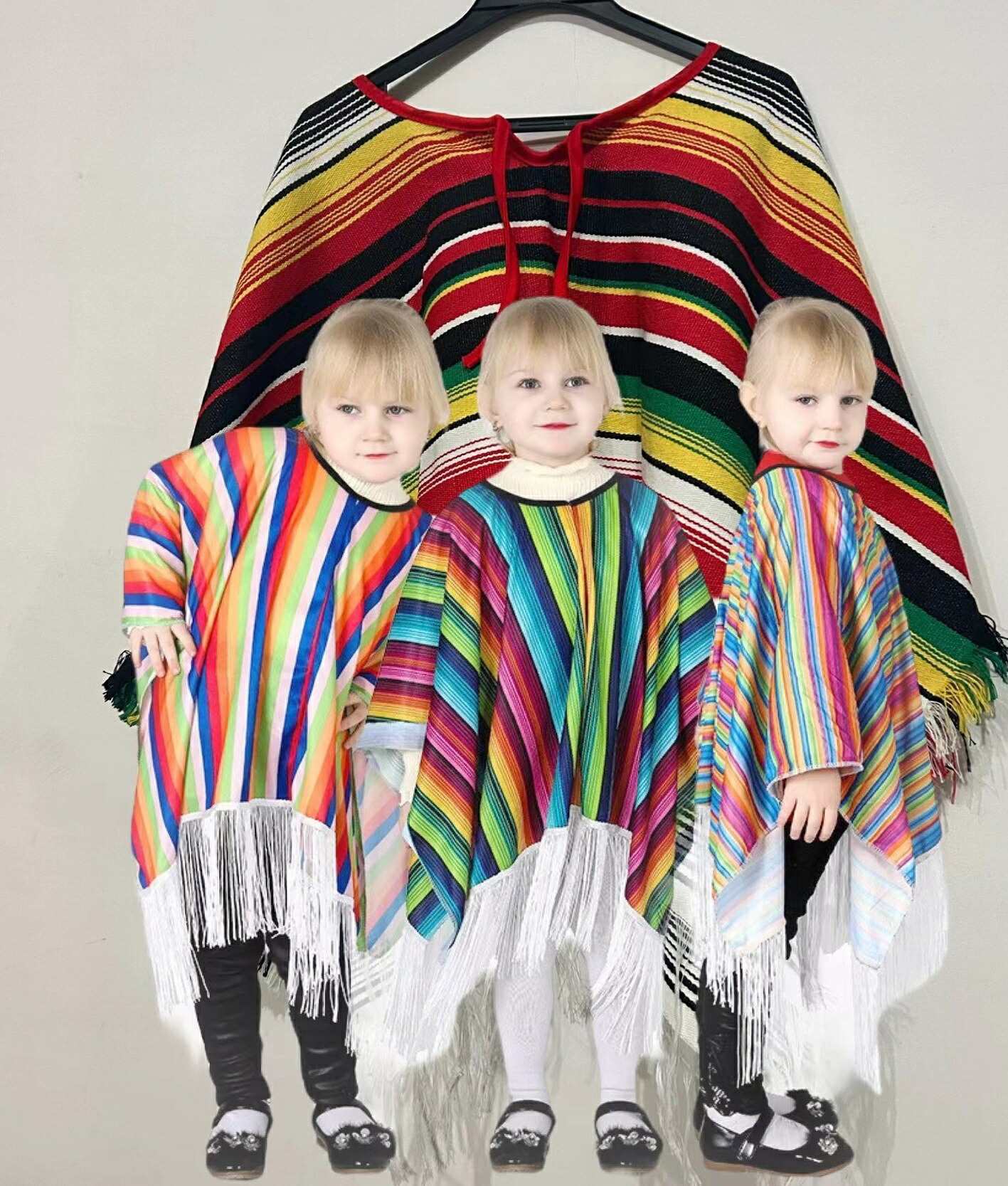 カラフルストライプ 子供 メキシコ サラペ 民族衣装 フリンジ付き メキシカン ポンチョ キッズ マント発表会 女の子 男の子 コスチューム ケープ 舞台衣装 団体服 パーティー ハロウィン 発表会