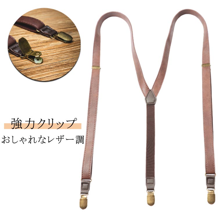 フォーマル フェイクレザー Y型 メンズ サスペンダー 20mm ライトブラウン 調節可能 ビジネス クリップ レザー 男女兼用 ブラウン PU