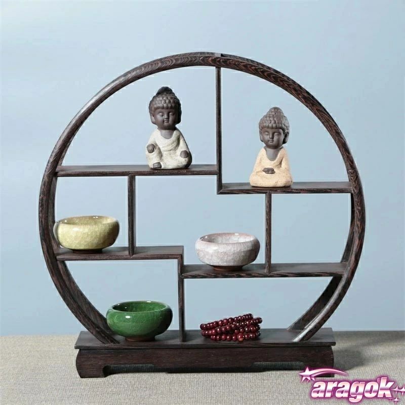 シノワズリ 中国風 珍品棚 木製 丸型 ディスプレイラック ウッドラック ナチュラルラック 収納家具 ラック 小 中国茶器 飾り棚|省ス 棚