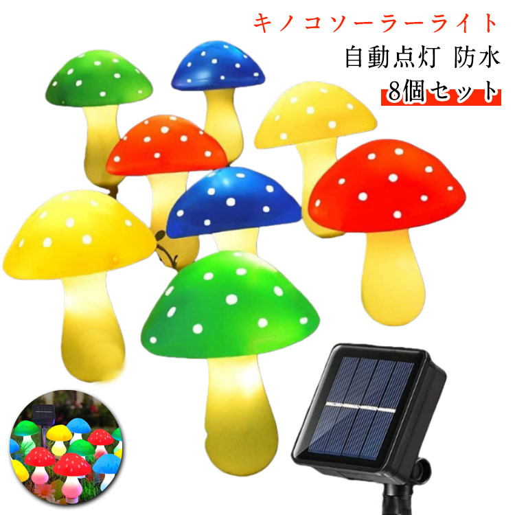8のキノコがお庭で可愛く鮮やかに光る童話風なガーデンソーラーライト