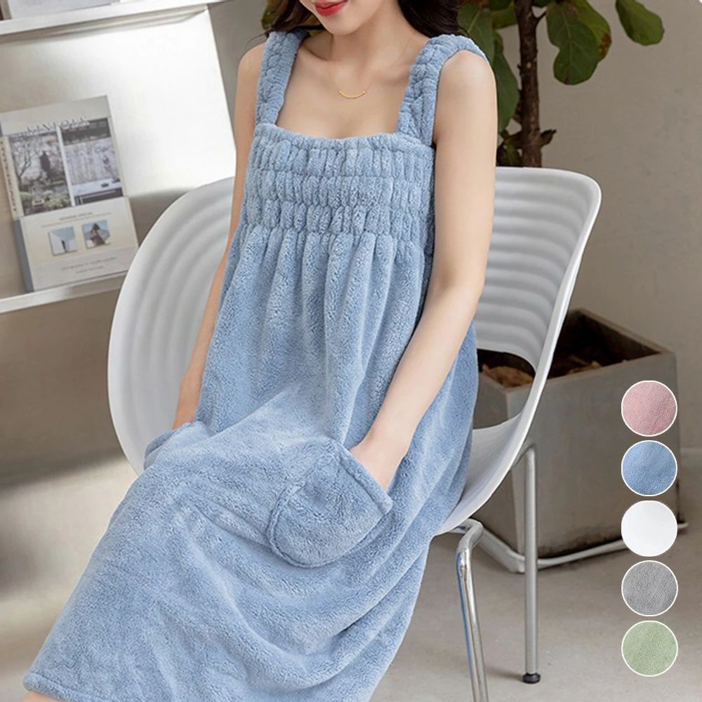 着るタオル バスローブ バスドレス タオルドレス 超吸水 お着替えタオル ラップタオル ボタン付き 巻きタオル 肩ひも付き ポケット付き 肌に優しい素材使用 繰り返 レディース