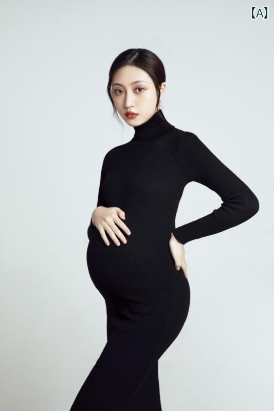 妊婦 フォト 衣装 マタニティ おしゃれ ファッション 写真 撮影 スタジオ 魅惑的 スリム 黒 セーター ニット ブラック ワンピース スカート フリーサイズ