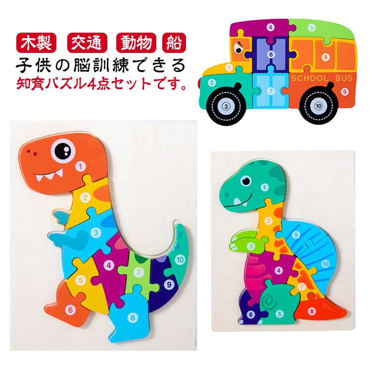 木製 動物 パズル 4点セット 木のおもちゃ 木製おもちゃ 型はめ 木製パズル 大きいサイズ 交通 車 プレゼント 知育おもちゃ 0歳 1歳 2歳 3歳 4歳 5歳 誕生祝い 出産祝い 誕生日 6歳