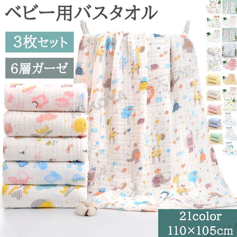 ベビーバスタオル ベビー バスタオル タオルケット 3枚セット かわいい キャラクター 車 恐竜 無地 6重ガーゼ 綿100% 肌に優しい 21柄 赤ちゃん 新生児 出 105×110CM