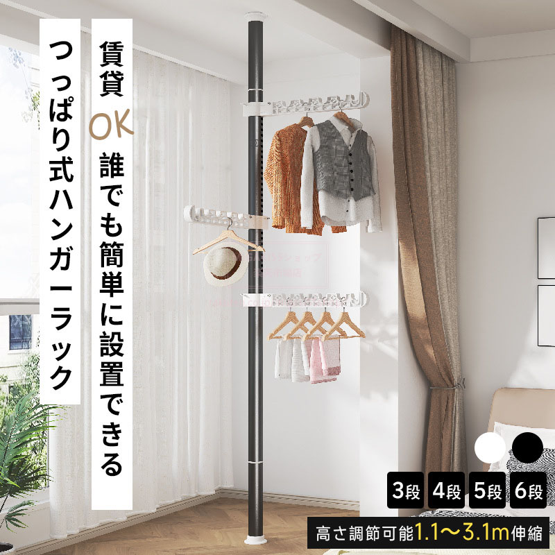 つっぱり式ハンガーラック 3段 4段 5段 6段 伸縮 高さ 110-310cm 突っ張り式 物干しスタンド 穴あけ不要 高さ調整可能 スリム コンパクト 省スペース 収納家具 衣類収納 洋 おしゃれ