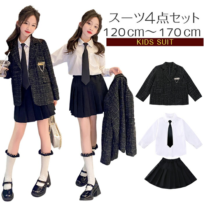 入学式 スーツ 子供服 女の子 卒業式 スカート セットアップ ツイード 4点セット ジュニア ジャケット シャツ ネクタイ フォーマル 可愛い お洒落 中学生 お受験 学院風 小学生