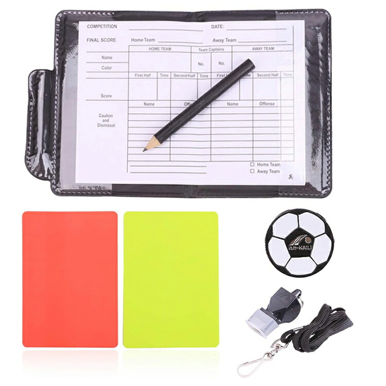 サッカーレフェリーセット 審判カード 赤と黄色のカード レコード紙 *5枚 鉛筆1本 トスコイン付き コーチホイッスル付き 警告カード レフリー小物 審判 小冊子 鉛筆 審判用品 フッ レコードカード