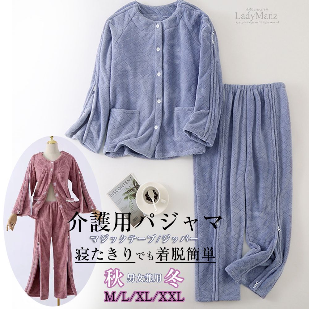 [秋冬用」 介護用パジャマ 寝たきり 上下セット パジャマセット パジャマ 長袖 トップス ボトムス 着脱簡単 ズボン レディース メンズ 通年用 全開フルオープン 要介 マジックテープ介護