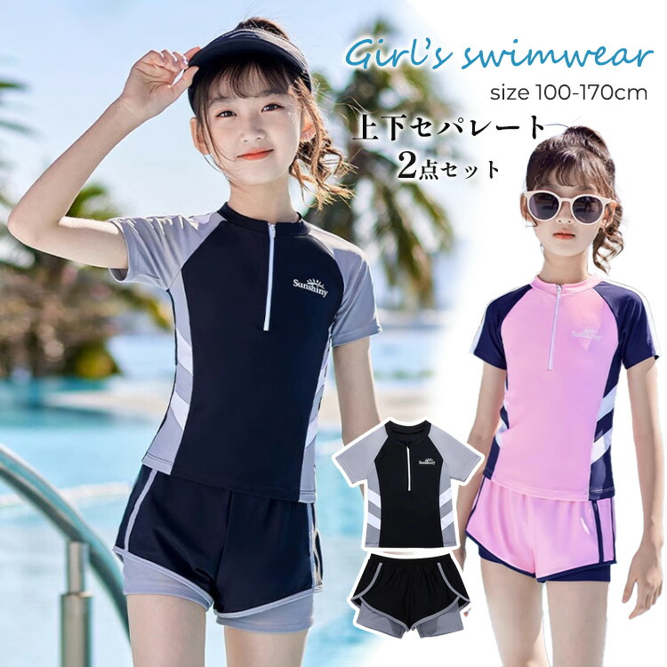 キッズ 女の子 スクール水着 セパレート 2点セット ジュニア水着 高校生 中学生 小学生 100-170cm トップス パンツ パッド付き 子供 紫外線対策 スイムウェア ガールズ 子ど 日やけ防止