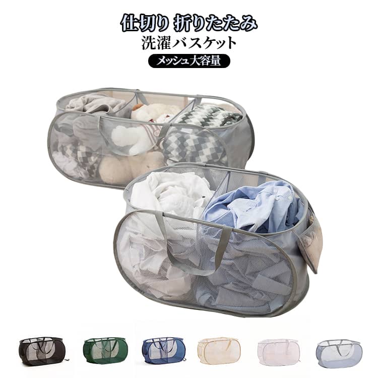 送料無料 洗濯カゴ 折りたたみ大容量 洗濯かご 2仕切り 3仕切り ランドリーバッグ 折りたためる 洗濯物入れ ランドリーバスケット メッシュ 大容量 おしゃれ 収納 軽量 コンパクト
