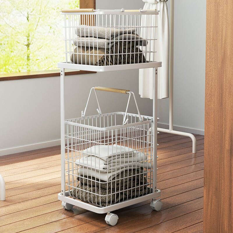 ランドリーワゴン ランドリーバスケット 2段 キャスター 北欧 収納 ワゴン スクエアタイプ バスケット おもちゃ入れ 持ち手付き おしゃれ シンプル 洗面所 新生活応援