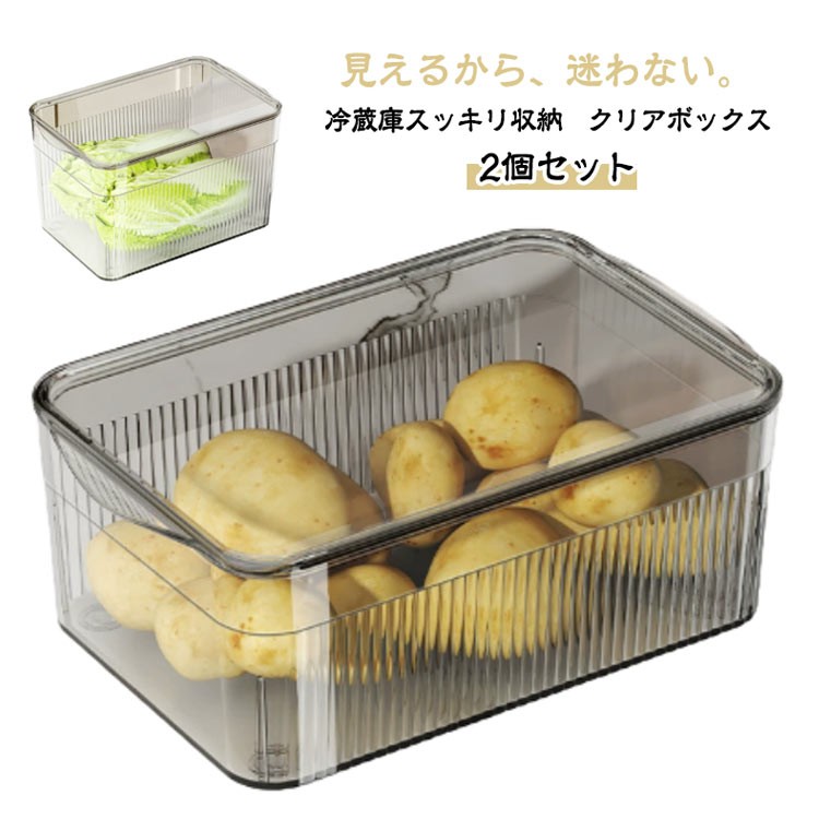 透明で清潔感のあるデザインの収納ボックス。野菜や果物の保存に最適で、蓋付きで乾燥やニオイ移りを防止します。