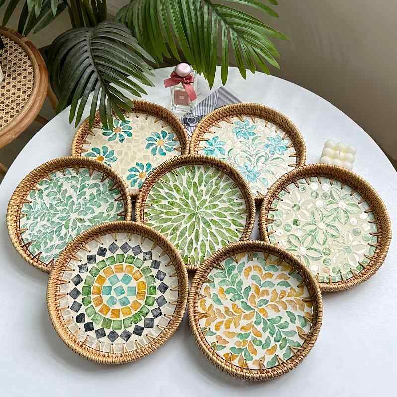 バスケット ベトナム 藤編み ラタン シェル装飾 フルーツ パン 朝食 お菓子 デザート トレイ かご 皿 北欧風 インスタ風 おしゃれ キッチン リビング テーブル 収納 ディスプレイ ダイニング