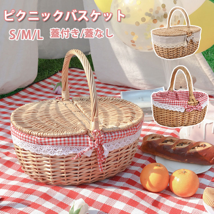 ピクニック バスケット かご かごバッグ レース内布付き 買い物かご 持ち手付き 籠バッグ 収納 おもちゃ 小物入れ おしゃれ インテリア 手編み 収納ボックス 北欧 蓋付きタイプ ラタン