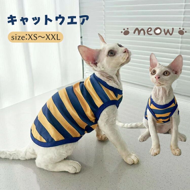 キャットウェア おしゃれ ストライプ バイカラー 犬服 猫服 柔らかい 肌着 ルームウェア インスタ映え デボンレックス スフィンクス猫 アビシニアン ペットウェア タンクトップ 夏 秋 無毛猫 春