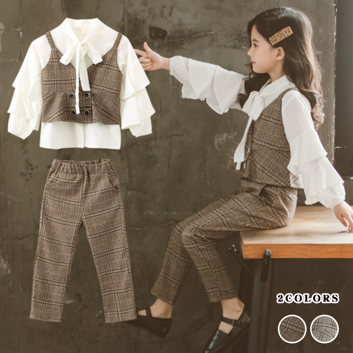 子供服 セットアップ 女の子 フォーマルスーツ 入学式 フォーマル スーツ パンツセット 子供スーツ チェック柄 ブラウス 3点セット ジュニア 入園式 卒業式 オシャレ 120 130 14 110