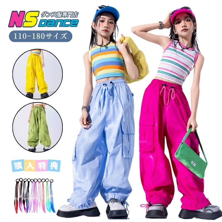 ダンス衣装 キッズ ガールズ キッズダンス衣装 セットアップ ヒップホップ 2点セット 4色 子供服 女の子 ベスト ヘソ出し 横縞 虹色 カーゴパンツ ロング丈 カジュアル 青 緑 ピンク パンツ