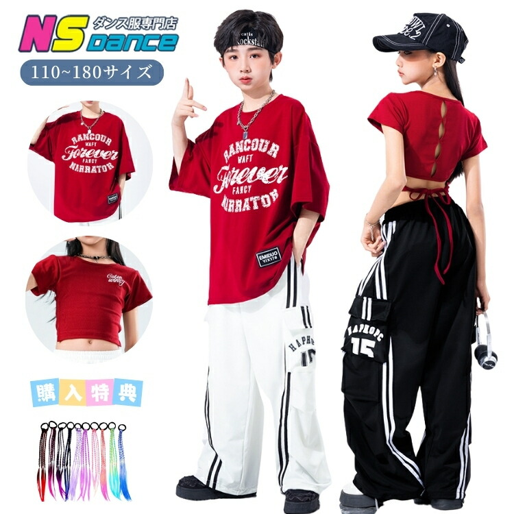 ダンス衣装 キッズ セットアップ ヒップホップ 子供服 2点セット 男の子 女の子 tシャツ 半袖 ワインレッド スポーツパンツ 黒 白 ロング丈 チアダンス 練習用 ステー パンツセット