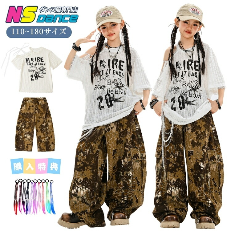 柄パンツ 蛇紋 ブラウン ダンス衣装 キッズ セットアップ ヒップホップ tシャツ 英字柄 肩オフ 白 子供服 女の子 ロングパンツ 演出服 発表会 舞台 ダンスウェア チアガール jazz 団体服