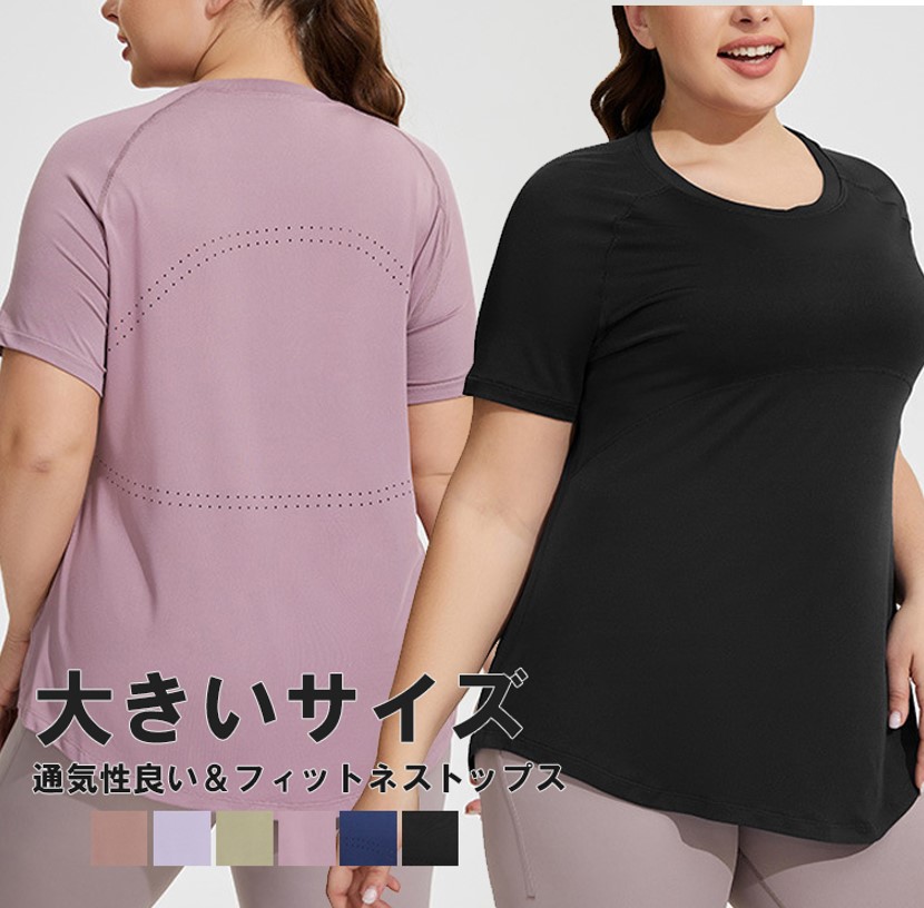 立体的で肉感を拾いにくい仕様 6色展開 ヨガウェア 大きいサイズ 半袖トップス 体型カバーTシャツ クルーネック 無地 メッシュ 通気性 スポーツ フィットネス トレーニング 吸汗速乾 ルームウェア