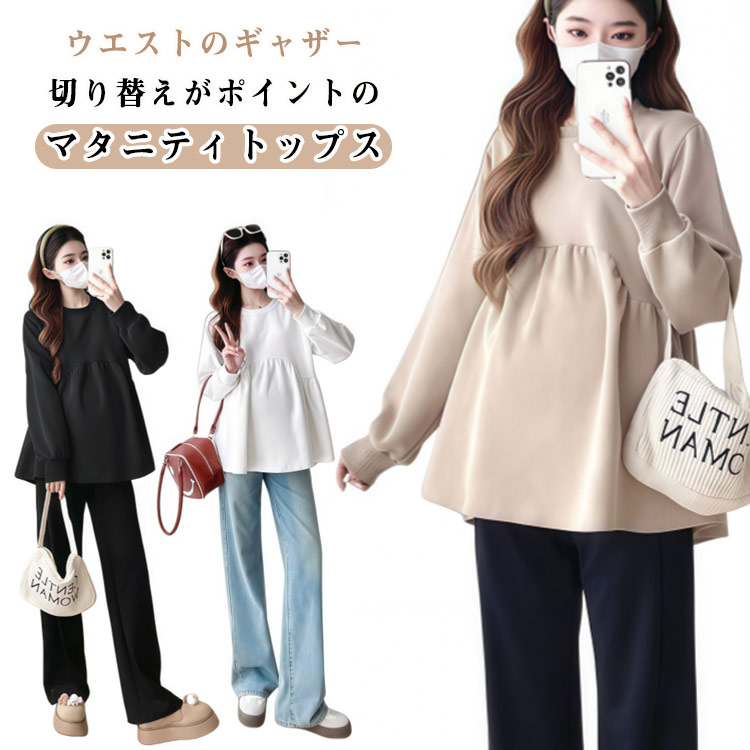 マタニティ トップス 長袖 レディース マタニティウェア ブラウス カットソー トレーナー マタニティ服 秋冬 産前 産後 クルーネック ギャザー切替 女性 体型カバー 脚長 あったか 春夏 ゆったり